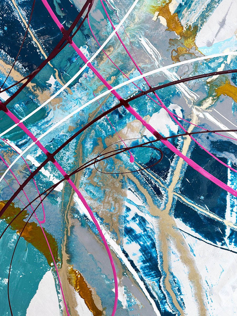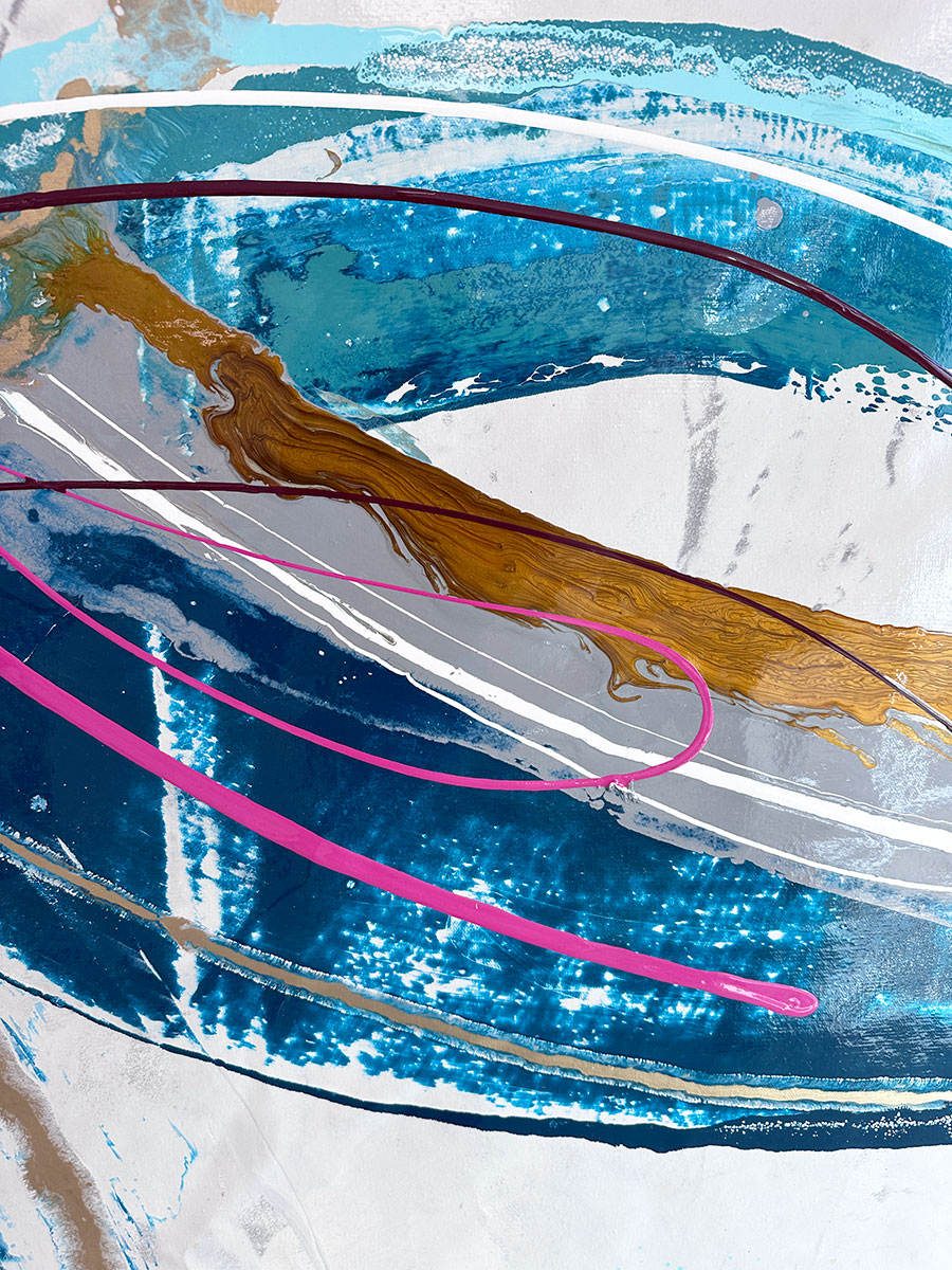 Anthus is a large abstract painting created with a series of overlapping radial arcs and semi circles. Some of these were moved around using a long pole with a window squeegee attached to it and others were poured on from shot glasses full of paint.