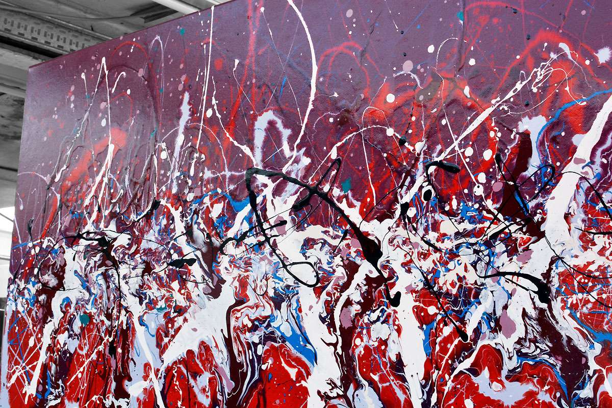 The colours are favourites of mine, no doubting that. But rarely do I ever go quite as bold as this. So let’s establish the technique before we go on; it’s a combination of methods but at its heart there’s a top half of purple and a bottom half of red enamel paint. Over this has gone a repeating sequence of dripped and splashed applications of white, black and a couple of shades of blue.