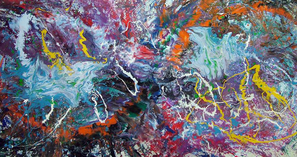 Intricate use of small layers of paint have been interlocked with large ones to produce two opposing sides linked by the orange and black arch. There are elements of water, fire and earth in here which gives the whole piece a feeling of grounded maturity.