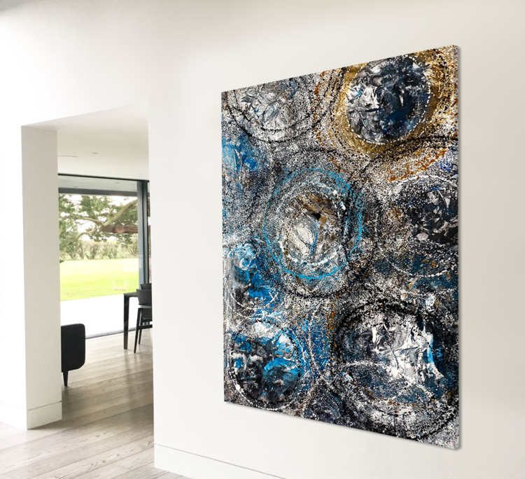 Love the Rain is a large abstract painting created with a series of overlapping half circles shapes that I commonly refer to as halos. These have an unusual application method and are applied using a self-built spin machine.