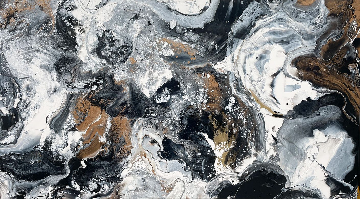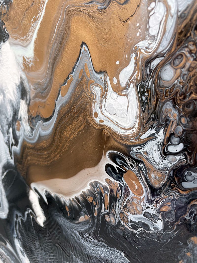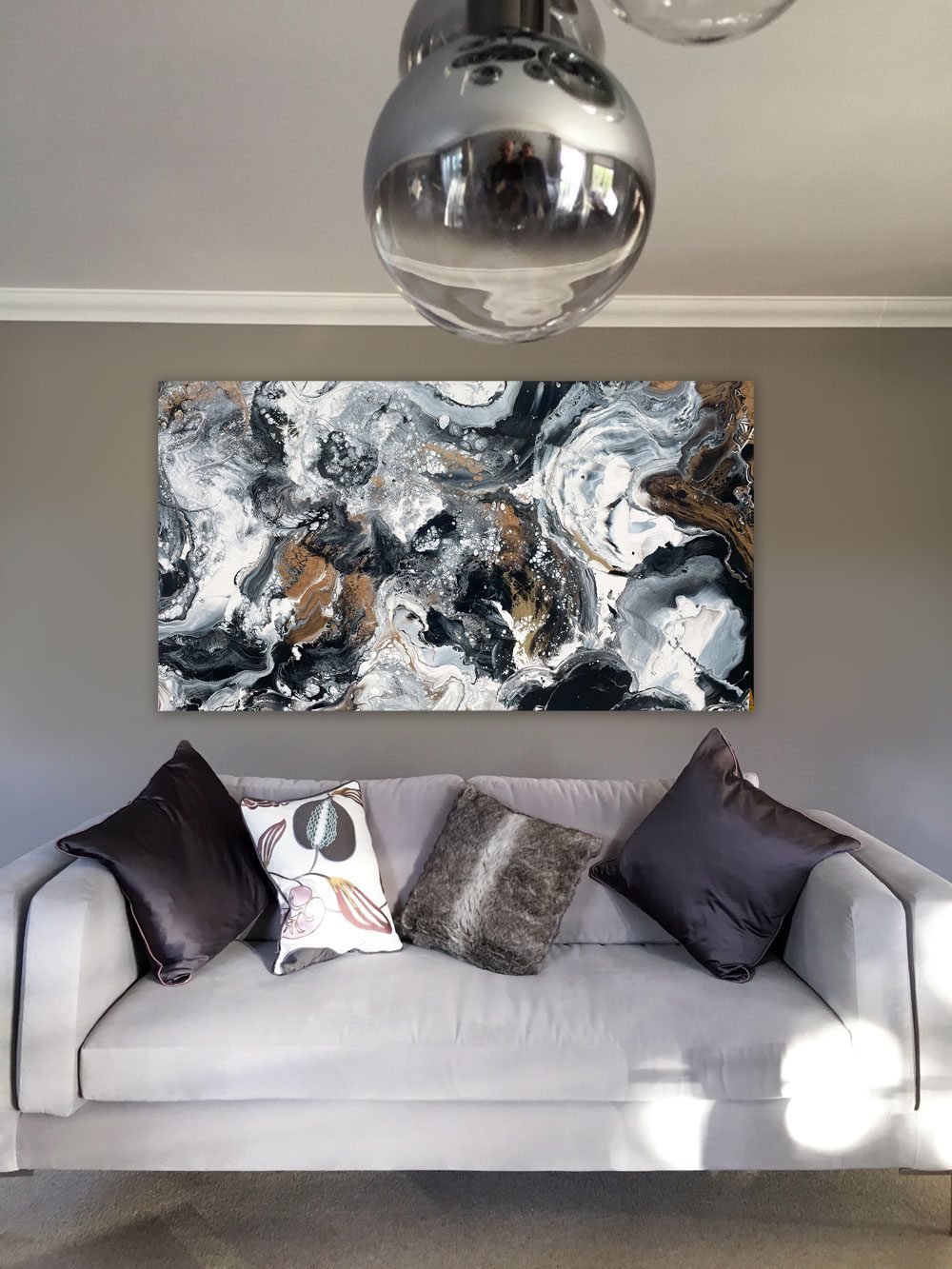 Lunar Eclipse is a magnificent, abstract expression of just three colours – black, copper and white. This minimal palette has given way to something extraordinarily complex and engaging; something that’s at complete odds with the amount of colours that produced it.