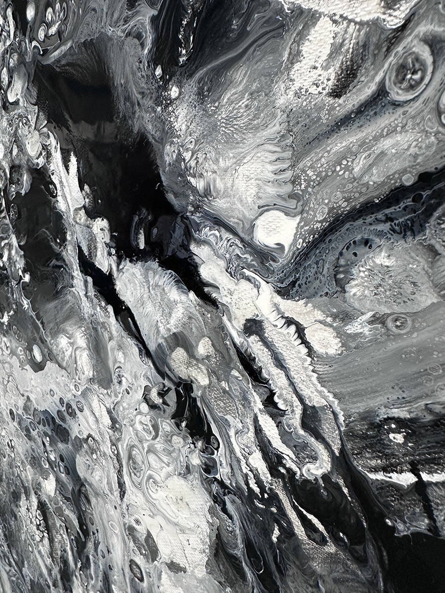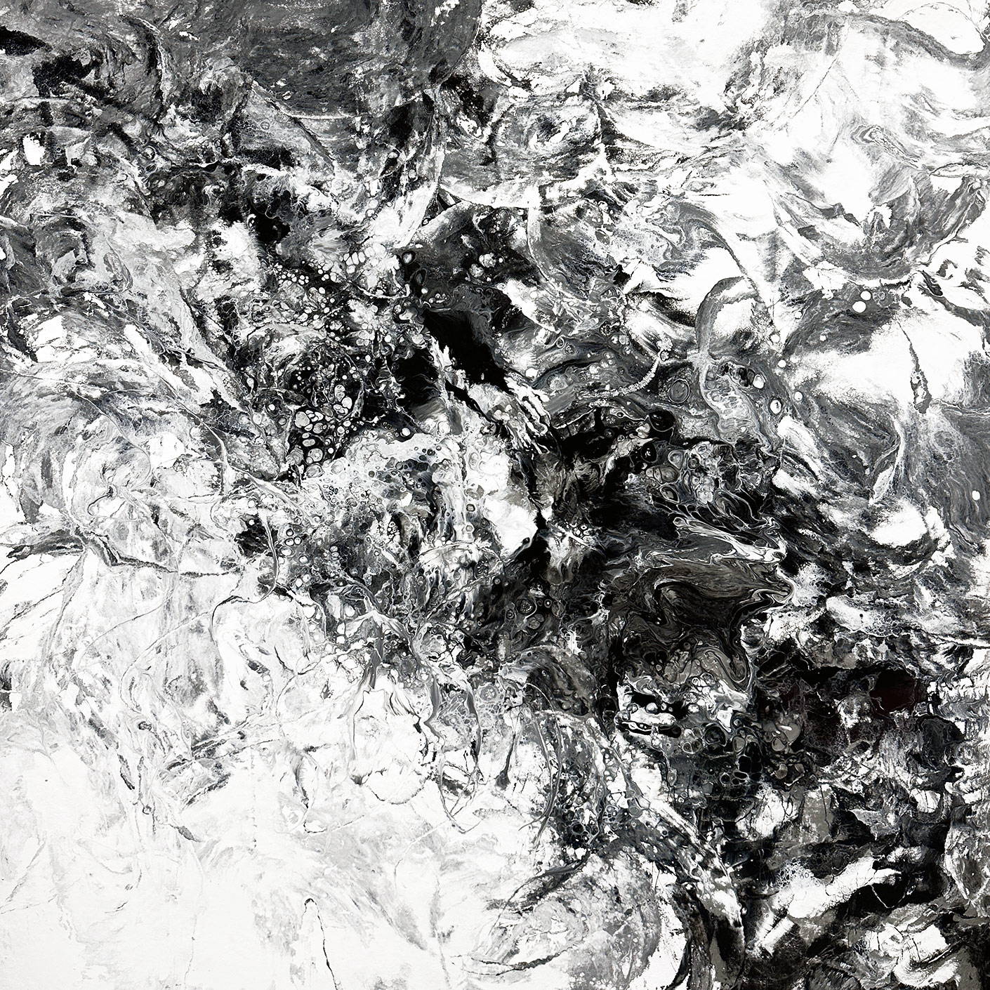 is a square abstract painting created with black and white enamel paints