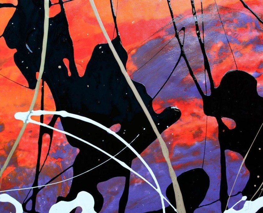 But it didn’t stop there. After that rich, glossy black was applied I went for it again with a series of careful applications in gold and white; much needed additions for what was a rather dark painting (even with all that purple and orange abounding).