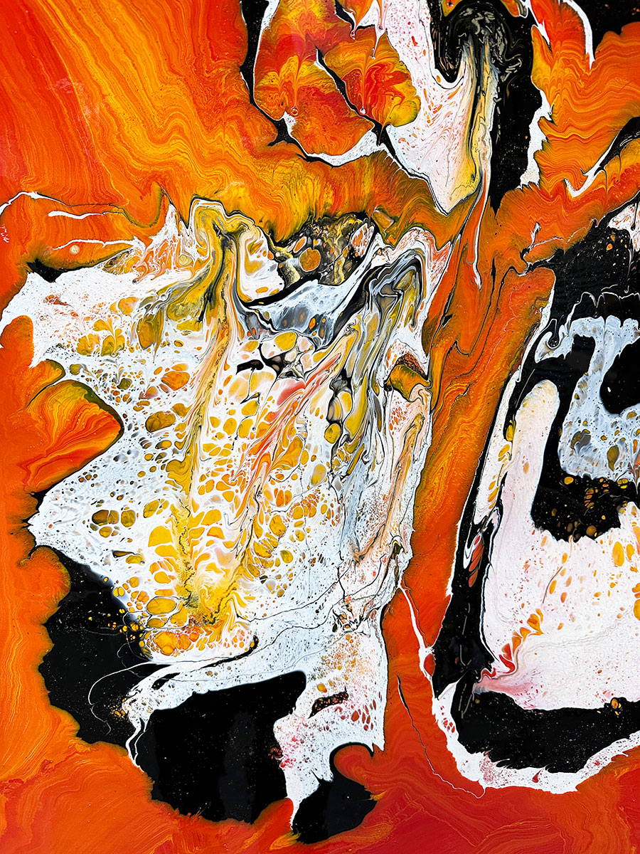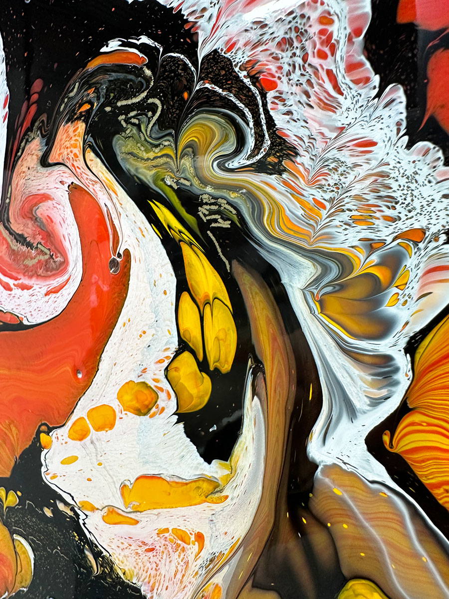 Phoenix Rising is a painting packed full of stunning details and rich, deep colour. The background was kept liquid whilst I poured the black and white over the top so you get this wonderful morphing of the two. In places you can see the background mixing with the foreground which really helps give the painting depth.
