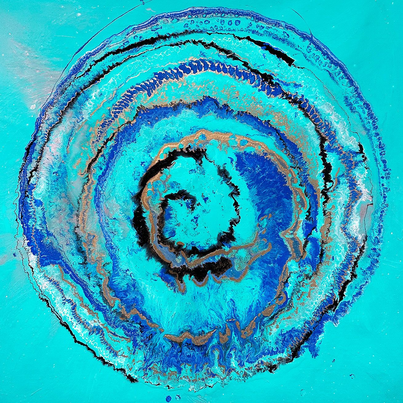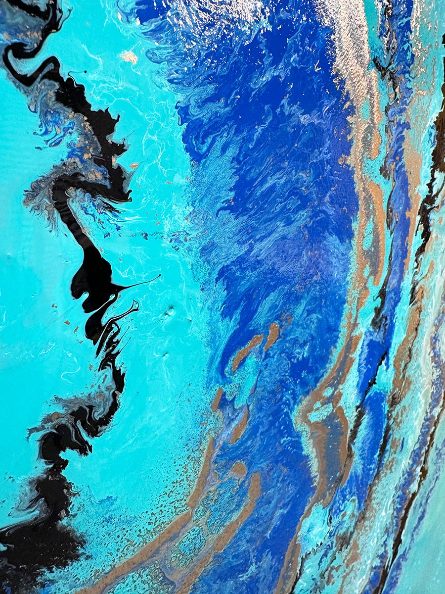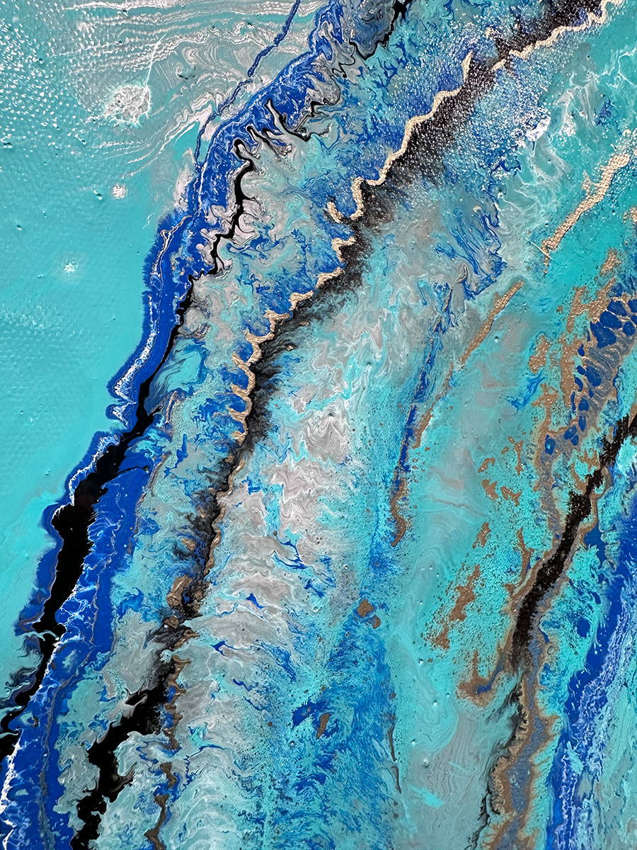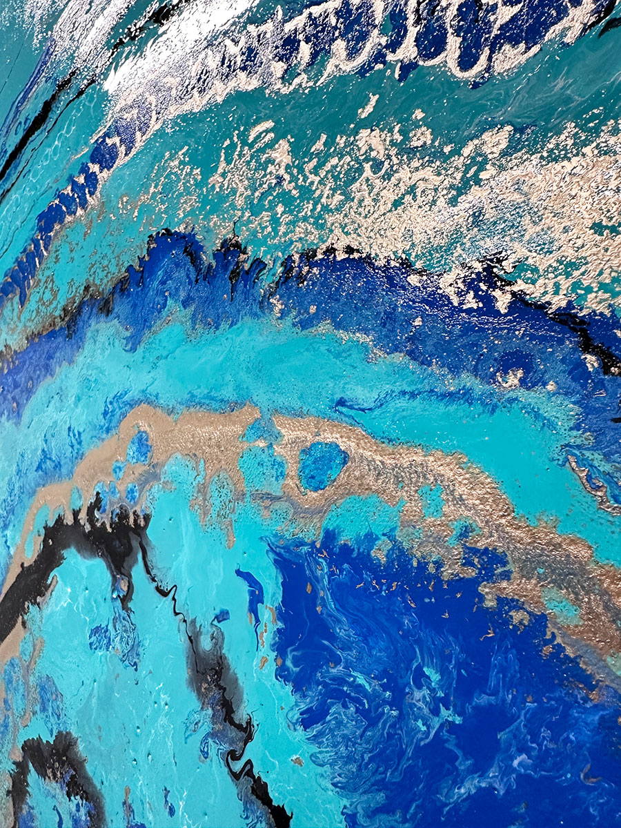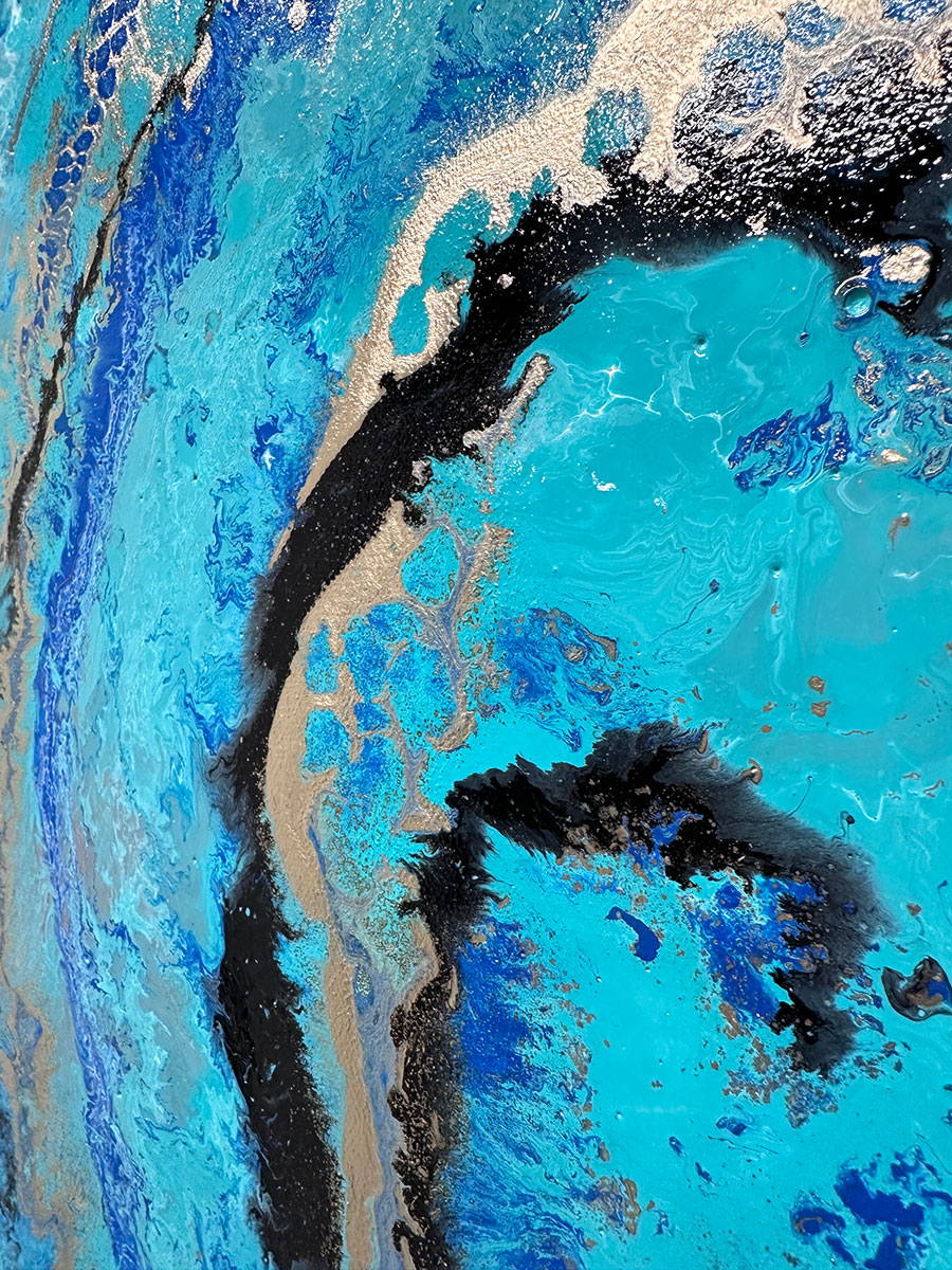 In this painting I have liberally applied it to the background and fused in a little metallic silver in one corner. On to this I put blue, gold and white in a gentle circular motion and finished it off with some gentle black swirls.